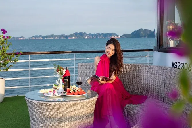 Comienza tu excursión de un día en la Bahía de Halong con recogida en hotel en Hanoi y un tranquilo viaje por pueblos locales. Navega entre islas de piedra caliza, disfruta un almuerzo de mariscos frescos a bordo, explora las frescas cámaras de la Cueva Sorpresa, haz kayak o pasea en bote de bambú por la laguna de la Cueva Luon, y nada o sube en la Isla Titop antes de volver mientras el atardecer pinta la bahía.