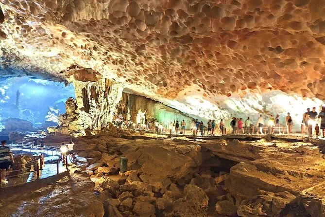 Almorzamos justo cuando pasábamos esas rocas con formas curiosas — el Incensario, el Gallo de Pelea — y nuestro guía nos las señalaba con historias que seguro ha contado mil veces, pero que aún lograba hacer sonar frescas. En la granja de perlas probé el kayak por primera vez (mis brazos todavía me lo recuerdan), deslizándome tan cerca de los acantilados que podías ver pequeños cangrejos correteando entre las grietas. La Cueva Sung Sot fue más impresionante de lo que esperaba; olía a tierra húmeda y se escuchaban risas de otro grupo que iba delante. La subida aceleró mi pulso — mejor llevar buen calzado si llueve. Ya de vuelta en el barco, al atardecer, había una promo de happy hour de compra dos y lleva uno gratis en el bar. Perdí la cuenta después de dos tragos, pero recuerdo haber charlado con Li, del equipo, sobre la pesca de calamares — se rió cuando intenté decir “mực” en vietnamita.