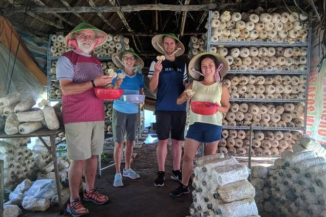Recorrimos la pequeña granja a las afueras de Saigón, recogiendo champiñones que parecían mini paraguas y aprendiendo qué plantas hacen que la sopa tenga un sabor más fresco, intenso o dulce. La señora Lan nos contó las recetas de su abuela mientras llenábamos nuestras canastas — decía que cada familia tiene su propia forma de preparar el caldo del pho. El clima estaba húmedo pero sin ser agobiante; el teléfono de alguien ponía canciones pop antiguas de fondo, y eso me hizo sonreír sin razón.