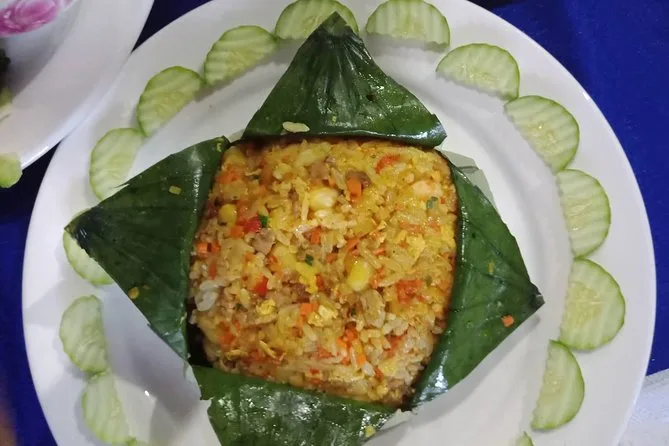 De regreso en la cocina (con paredes abiertas y ventiladores girando), lavamos lo que habíamos recogido y nos pusimos manos a la obra con los rollitos de primavera. Nunca imaginé lo pegajosa que puede ser la hoja de arroz hasta que se me quedó en los dedos — la señora Lan me enseñó a enrollar sin que se rompiera. Cocinamos cuatro platos: rollitos de camarón con cilantro, ensalada de papaya (yo elegí la versión vegetariana), estofado de pollo y un rollito de plátano con crema de coco que todavía recuerdo cuando me da hambre a altas horas.