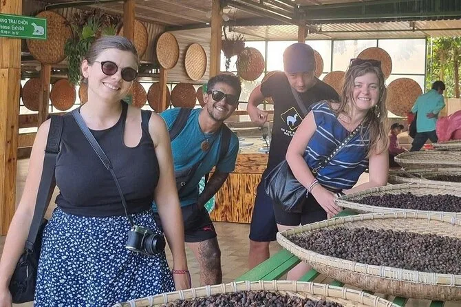 Después, nos subimos a la van—ventanas abiertas porque el aire olía a hierba mojada—y nos dirigimos a Melinh Coffee Garden. Aquí el café no solo es fuerte; tiene un sabor salvaje (lo llaman “café loco”). Intenté preguntar en vietnamita y terminé haciendo reír a todos. Nos sentamos mirando las filas de cafetos mientras Tuan nos contaba cómo tuestan los granos justo ahí. El silencio era agradable—solo algunos pájaros, motos lejanas, nada más.
