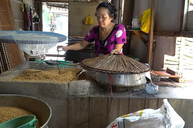 Después de Cai Rang, paramos en una fábrica de fideos de arroz — el aroma a arroz al vapor me llegó de inmediato. Ver cómo estiraban y cortaban los fideos a mano me hizo valorar aún más mi desayuno (aún recuerdo esa textura). Más tarde, en la antigua casa 10 Vo, intentamos hacer bánh xèo. El mío se pegó a la sartén, pero Li se rió y dijo que parecía “auténticamente casero,” que probablemente es su forma de decir “desastre.” Comimos juntos bajo un ventilador que apenas movía el aire caliente. Algunos salieron a dar una vuelta en bici; yo me quedé un rato escuchando a los gallos cerca.