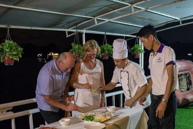 El tour ofrece kayak en la zona de la granja de perlas, baño o senderismo en la isla Titop, visita a la cueva Sung Sot, sesión de tai chi en cubierta y clase de cocina vietnamita.