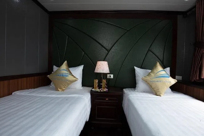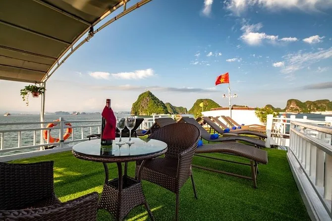Tu experiencia nocturna incluye traslado en autobús desde hoteles del Barrio Antiguo de Hanoi, todas las entradas a atracciones de Ha Long Bay como la cueva Sung Sot y la isla Titop, equipo de kayak en la zona de la granja de perlas (según paquete), todas las comidas a bordo desde el almuerzo hasta el almuerzo de despedida, guía local de habla inglesa durante todo el viaje, sesión de tai chi en cubierta por la mañana, clase de cocina vietnamita al atardecer con un chef experto en la cubierta soleada, además de alojamiento en cabina privada con baño en suite y vistas a la bahía antes del cómodo regreso en autobús a Hanoi por la tarde.