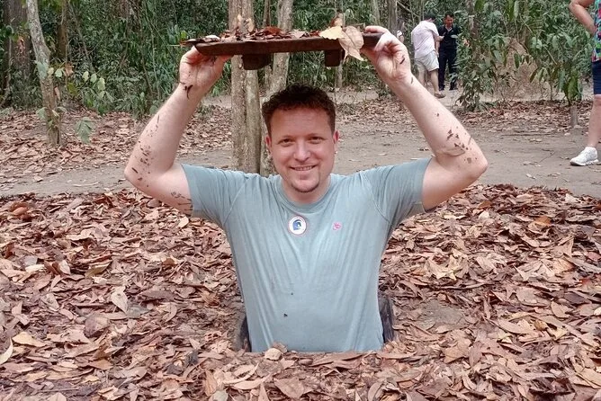 No esperaba disfrutar tanto el paseo en sampán; deslizarse bajo las palmeras cocoteras con solo el sonido del agua contra la madera fue casi meditativo (hasta que sonó un teléfono). Ver cómo hacen el dulce de coco fue extrañamente satisfactorio—manos pegajosas por todas partes—y compré un poco aunque sabía que se derretiría en mi mochila antes de volver a Saigón. Éramos solo diez en el grupo, así que nunca se sintió apretado ni apresurado. A veces todavía pienso en la oscuridad de esos túneles—qué vida tan distinta debió ser allá abajo.