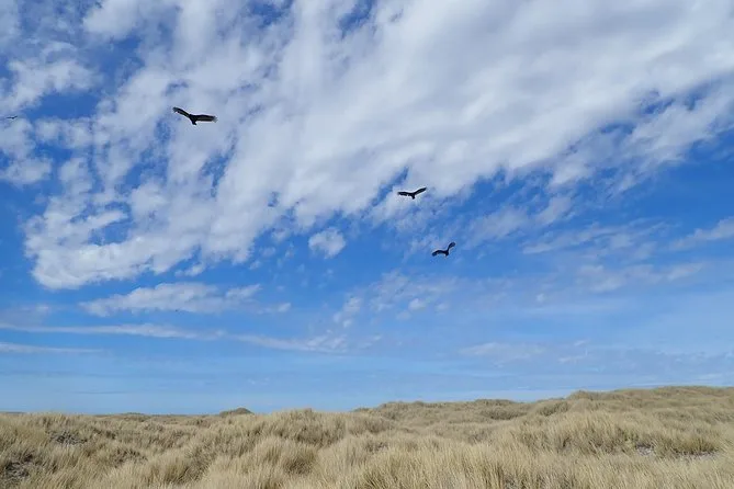 We had coffee right there on the beach — instant stuff in paper cups, nothing fancy but somehow perfect with that cold breeze and all those birds around. Someone asked Tomás about life here in winter and he shrugged, saying you get used to “the sideways rain.” He showed us how to spot dolphin gulls (red beaks, easy to remember) and told a story about a sheep getting stuck on the beach once — everyone laughed except maybe the sheep.
