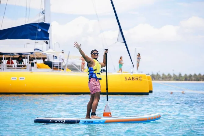Your day includes return hotel pickup by coach from Nadi or Denarau areas to Port Denarau where you’ll board SABRE for a full-day sailing adventure through Fiji’s Mamanuca Islands. You’ll have use of snorkel gear and paddle boards at untouched reefs and sand cays. Morning tea and a chef-designed buffet lunch are served onboard along with complimentary soft drinks all day plus beer and wine from lunchtime onwards before returning in the evening.