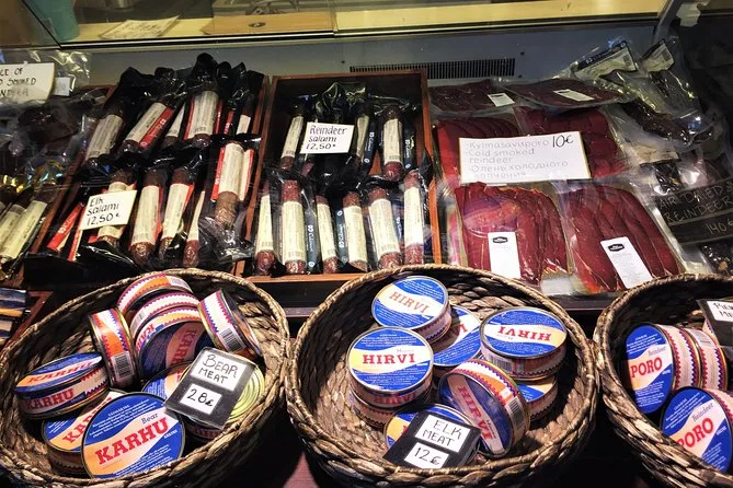 You’ll try cold-smoked reindeer meat, local sausages, fish specialties, traditional squeaky bread cheese with cloudberry jam, and famous Fazer candies.