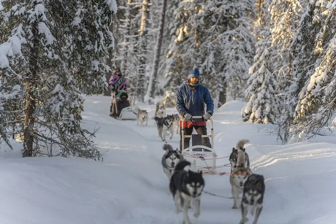 Your day includes pickup and drop-off from Santa Claus Holiday Village Hotel or their office in Rovaniemi, warm winter clothing (overalls, boots, gloves), a roughly 10km self-drive or passenger husky sleigh ride led by an English-speaking guide (other languages available), a visit to a working Husky Farm with stories about training these incredible dogs, plus Finnish gingerbread cookies and hot drinks around the fire before heading back out into the snow.