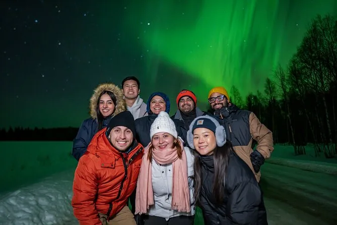 Your night includes hotel pickup and drop-off in Rovaniemi, guaranteed Northern Lights viewing with an expert local guide using unlimited mileage and time on a modern bus, small group comfort (up to 8 people), adult winter overalls if needed, snacks with hot drinks under open skies, all fees and taxes covered, plus professional photography service so you don’t have to worry about missing that moment.