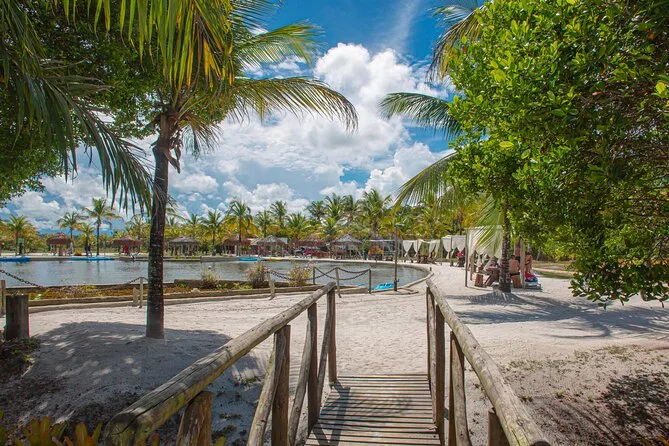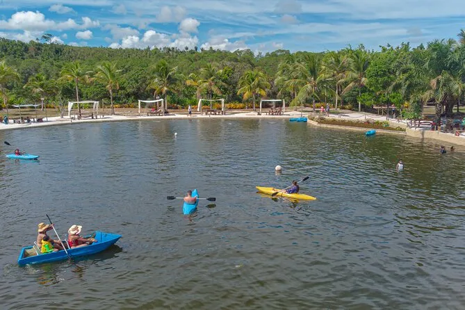 Votre journée comprend l’accès à toutes les activités principales : balade à cheval dans les sentiers forestiers, kayak ou glissade dans le lac, tyrolienne pour les plus audacieux, terrains de sport pour les fans de foot ou basket, aires de jeux avec toboggans et bassins de sable pour les enfants — sans oublier la pêche en catch-and-release et la balade en train panoramique pour les moments de flemme après le déjeuner. Toutes les activités sont incluses dans le prix du billet ; vous pourrez aussi profiter du restaurant en plein air qui marie barbecue uruguayen et saveurs bahianaises.