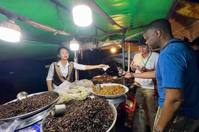 Vous goûterez des nouilles sautées cambodgiennes, la soupe Num Banh-Chok au curry vert, des desserts, des brochettes et des insectes frits en option.