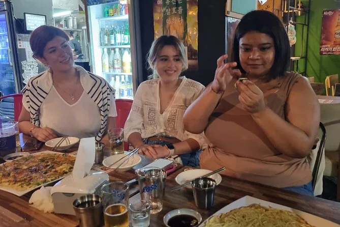 Votre soirée comprend tous les jeux d’alcool coréens animés par un guide local sympathique surnommé « Hongdae Boy », des verres de bière et de soju pour préparer Somaek ou Soju Bombs (avec options sans alcool si vous préférez), ainsi qu’une crêpe chaude aux fruits de mer au kimchi servie à votre table dans l’ambiance animée des bars de Hongdae.