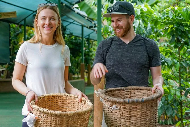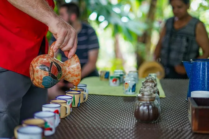 Votre journée comprend des visites guidées des processus du café et du cacao chez Don Juan Tours Arenal à La Fortuna, des moments pratiques pour moudre les fèves ou fabriquer votre propre tablette si vous le souhaitez, ainsi que de nombreuses dégustations — du café local fraîchement préparé à plusieurs variétés de chocolat costaricien authentique — le tout sur des sentiers accessibles, quel que soit le temps.
