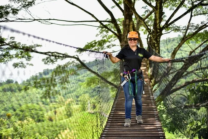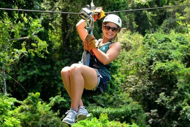 Au centre d’aventure, nous avons embarqué sur un tracteur pour une montée cahoteuse jusqu’à la colline. Les guides distribuaient les harnais en plaisantant, vérifiant chaque sangle avec soin. J’entendais des singes dans les arbres — honnêtement, mes mains étaient moites avant même de voir la première plateforme. Il y a 12 plateformes reliées par 10 tyroliennes, dont une qui fait presque un demi-kilomètre. En survolant la canopée, on aperçoit par moments l’océan entre les feuillages verts. Le vent sur le visage, c’est une montée d’adrénaline pure, mais ça passe en un éclair.