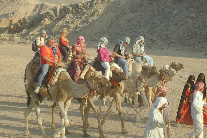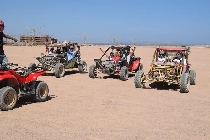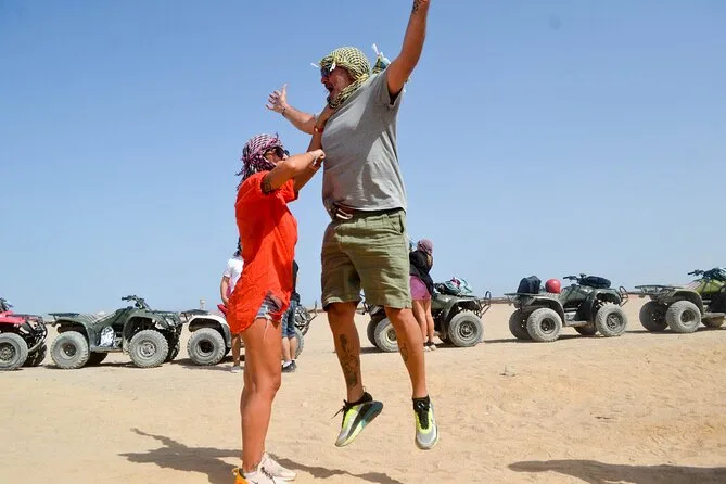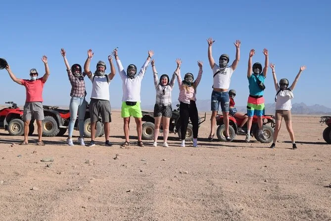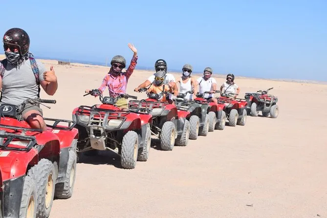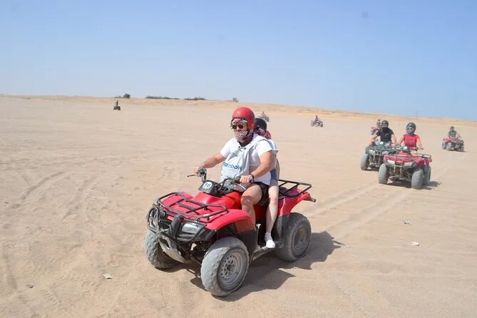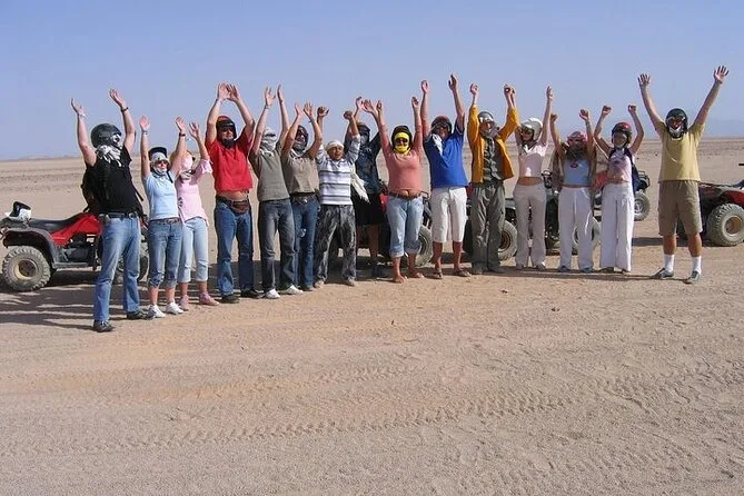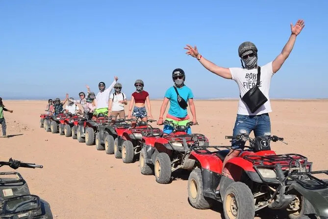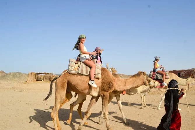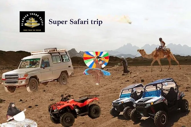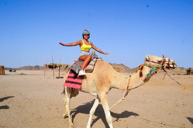 Votre journée comprend le transfert hôtel à Hurghada, toutes les balades (quad, buggy, 4x4), l’entrée au camp bédouin avec thé traditionnel et balade à dos de chameau, ainsi qu’un dîner BBQ égyptien complet avec boissons avant le retour en soirée.