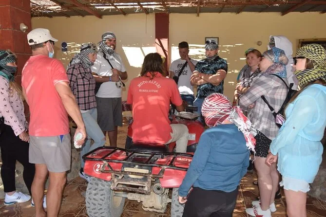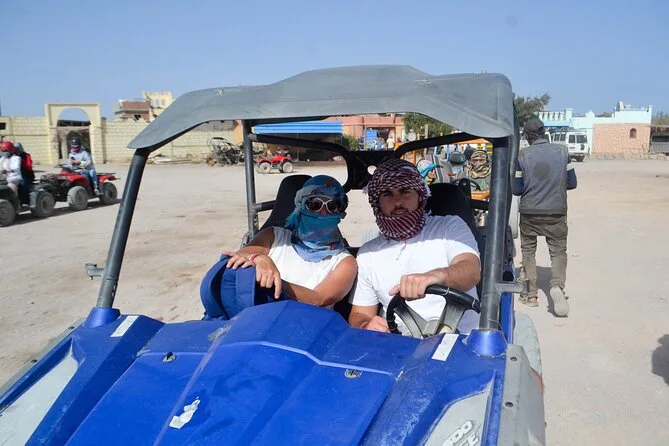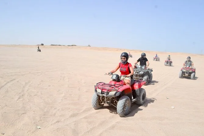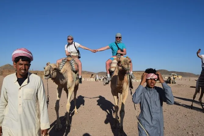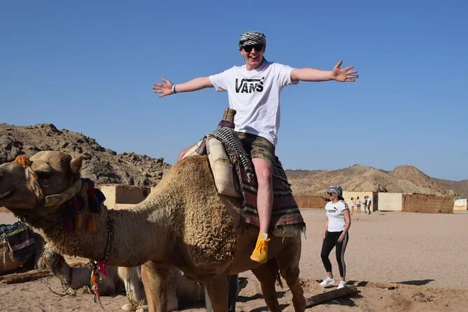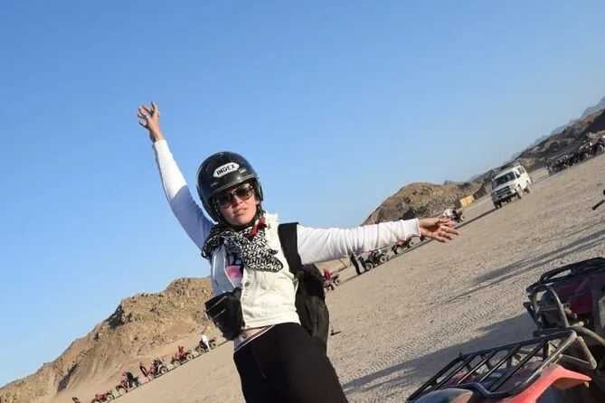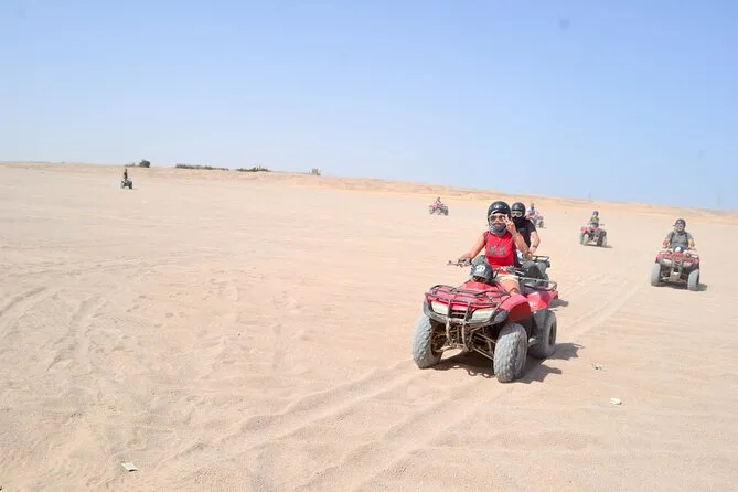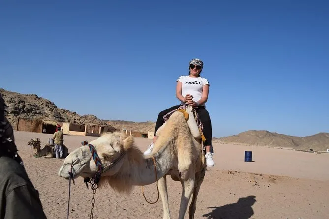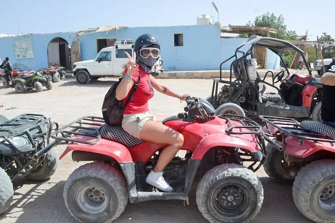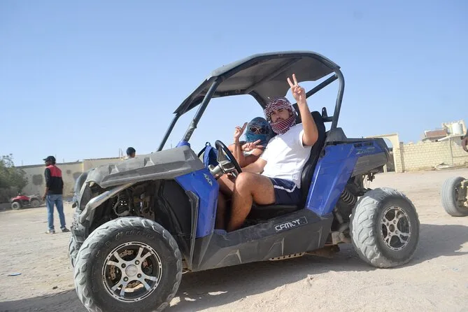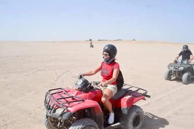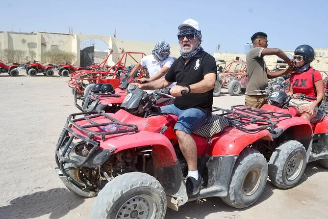 Votre journée comprend le transfert hôtel à Hurghada, toutes les balades (quad, buggy, 4x4), l’entrée au camp bédouin avec thé traditionnel et balade à dos de chameau, ainsi qu’un dîner BBQ égyptien complet avec boissons avant le retour en soirée.