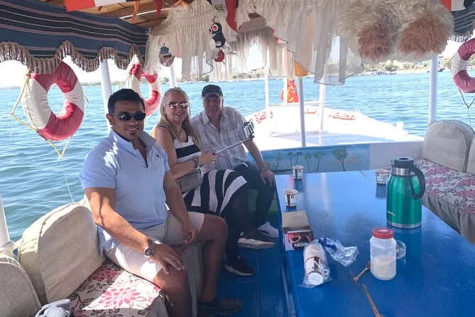 Le déjeuner a été une belle surprise : poulet grillé avec du pain plat tiède et une sauce acidulée dont je n’ai toujours pas le nom (Ahmed l’a appelée « duqqa » — j’ai sûrement mal prononcé). On a mangé à l’ombre, près du Nil, avant de monter à bord d’un petit bateau pour la balade incluse. Le fleuve était calme, d’un vert doux ; quelqu’un jouait de la musique doucement sur son téléphone pas loin. C’était un vrai plaisir de juste flotter un moment après toute cette chaleur et cette histoire.