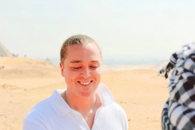Le photographe nous a rejoints tout de suite — super sympa, sans jamais être envahissant. Il connaissait tous les petits angles pour prendre des clichés sans personne en arrière-plan. À un moment, il m’a demandé de faire sérieux, mais j’ai éclaté de rire quand un chameau derrière moi a éternué (bruyamment). À propos des chameaux : la balade autour des pyramides était à la fois drôle et un peu flippante au début — ils sont plus grands qu’on ne croit sur les photos ! La vue d’en haut est incroyable ; on voit les limites du Caire fondre dans le désert, et soudain, il n’y a plus que toi et ces formes anciennes. Je repense souvent à ce panorama quand le bruit reprend chez moi.