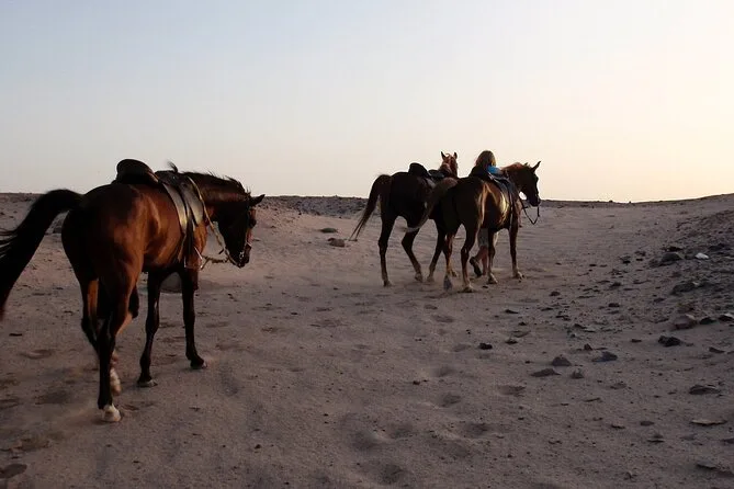 Partez pour une balade à cheval douce entre plage et désert près de Sharm El Sheikh, guidé par des locaux qui connaissent chaque recoin du sable. Transfert hôtel, équipement de sécurité et histoires au fil du chemin, plus ces instants de calme où il n’y a plus que vous, votre cheval et l’immensité.
