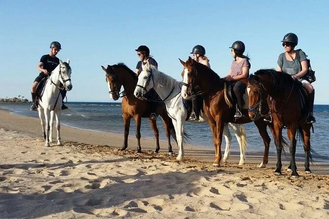 Votre journée comprend la prise en charge et le retour à l’hôtel à Sharm El Sheikh, tout l’équipement de sécurité comme les casques fournis par des moniteurs locaux qui vous accompagnent tout au long de votre balade d’une ou deux heures à cheval entre plage et désert — avec conseils adaptés que vous soyez débutant ou confirmé, avant de vous ramener à votre hôtel.