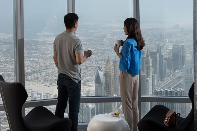Si vous aimez les détails, ne manquez pas les écrans multimédias — ils montrent des photos anciennes de Dubaï avant l’arrivée de tous ces gratte-ciel. Notre guide a mentionné qu’au coucher du soleil, on peut parfois sentir une brise sur la terrasse extérieure et percevoir l’odeur des kebabs grillés venant des vendeurs ambulants près du Dubai Mall. Nous sommes restés assez longtemps pour voir les fontaines commencer leur spectacle en contrebas — la musique résonnant faiblement même à cette hauteur, l’eau captant les lumières de la ville.