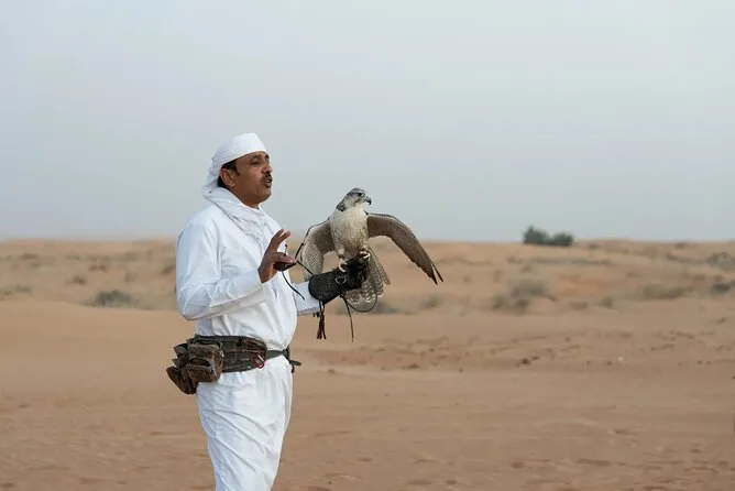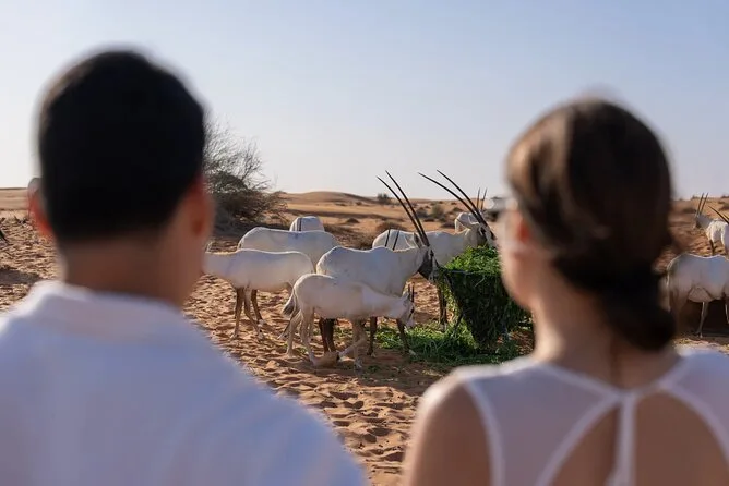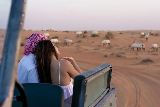 Votre journée inclut un transfert de luxe depuis Dubaï vers la réserve naturelle où vous roulerez en Land Rover vintage sur les dunes avec un guide local ; vous observerez oryx arabes et gazelles ; assisterez à une démonstration de chasse au faucon en direct ; pourrez essayer la balade à dos de chameau et le sandboard si vous le souhaitez ; recevrez un ghutra traditionnel en souvenir ; vous détendrez autour d’un café arabe, dattes et eau de rose à l’arrivée ; vous installerez dans un majlis au camp bédouin pour des tatouages au henné réalisés par des artistes talentueux ; savourerez un dîner émirati en quatre plats servi à table avec service de chicha ; et profiterez de musique live et animations avant de retourner en ville sous les étoiles du désert.