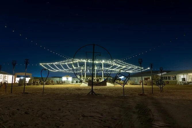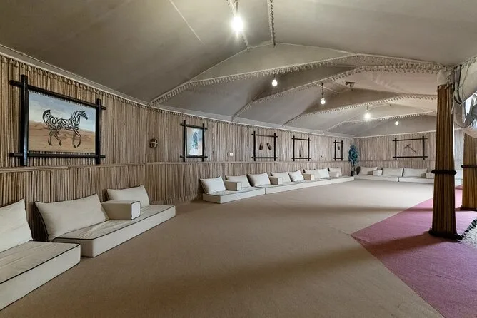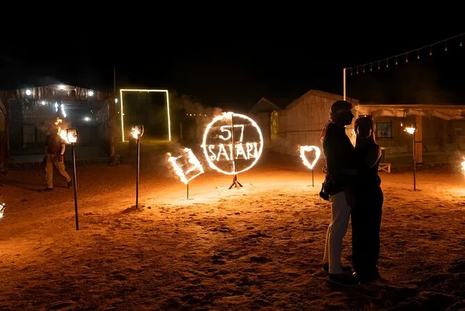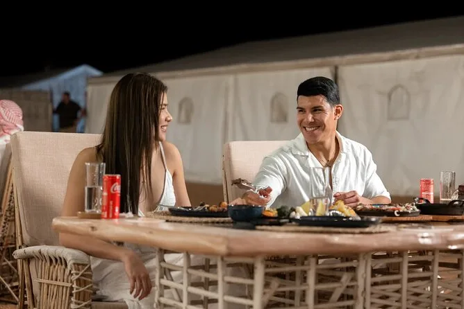 Le camp ressemblait à un autre monde — lanternes partout, tapis sous les pieds, cette odeur de cardamome qui flottait autour du café arabe. Quelqu’un a versé de l’eau de rose sur nos mains ; c’était frais et floral. Le dîner est arrivé en quatre plats (j’ai perdu le compte après l’agneau), pendant que des artistes au henné dessinaient des motifs sur nos bras et que la musique jouait en fond. Il y avait aussi de la chicha si vous en aviez envie — j’ai essayé une bouffée et j’ai toussé comme un fou (la table d’à côté a ri avec moi, pas de moi). Sur le chemin du retour, je n’arrêtais pas de penser à ces dunes sous les étoiles — vous savez, ces endroits qui restent gravés en vous ?