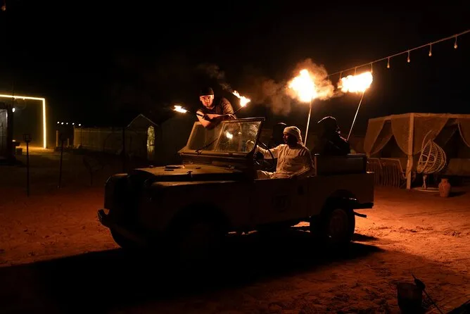 Partez pour une soirée inoubliable dans le désert de Dubaï : traversez les dunes en Land Rover vintage, observez la faune arabe, admirez les faucons en plein vol et partagez un dîner émirati sous un ciel illuminé de lanternes. Avec balades à dos de chameau, tatouages au henné, chicha à table et l’accueil chaleureux des locaux, cette nuit-là vous marquera longtemps après votre retour.