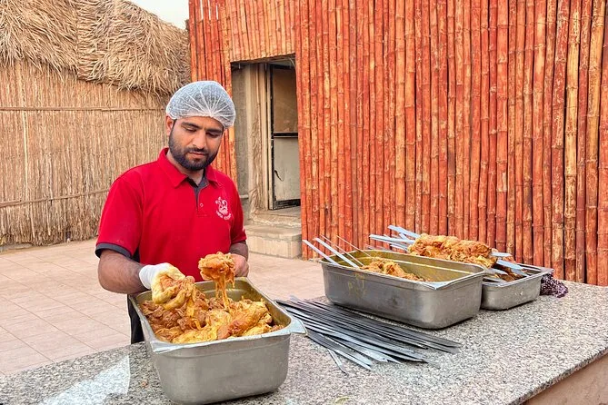J’ai ensuite essayé le sandboard (pas très élégant), et Ahmed a juste souri en disant que tout le monde tombe la première fois. Il m’a tendu une bouteille d’eau fraîche sortie de sa glacière — un vrai bonheur après tout ce soleil. Le trajet vers le camp bédouin était plus calme ; on était sûrement fatigués ou juste en train de savourer l’instant. Des chameaux attendaient à l’entrée, mâchant tranquillement comme s’ils avaient tout le temps du monde. Ma courte balade à dos de chameau a été plus cahoteuse que prévu, mais étrangement apaisante. L’odeur du charbon de bois flottait depuis le coin BBQ — honnêtement, j’avais plus faim que je ne voulais l’admettre.