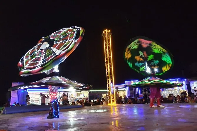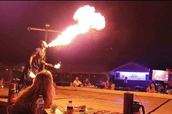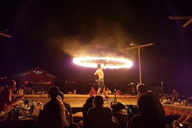 Dans le camp, des enfants couraient entre les tables avec du henné sur les mains pendant qu’on servait le thé dans de petits verres. Le repas est arrivé vite : poulet grillé, salades, un plat épicé dont je ne me souviens plus le nom. Pendant le dîner, des danseurs tournaient dans des jupes colorées (le spectacle Tanoura) puis un cracheur de feu a fait frissonner tout le monde au moins une fois. C’était comme si tout le monde se détendait ensemble sous ces guirlandes lumineuses — des inconnus partageant assiettes et histoires le temps d’une soirée avant de retourner aux lumières de la ville de Dubaï.