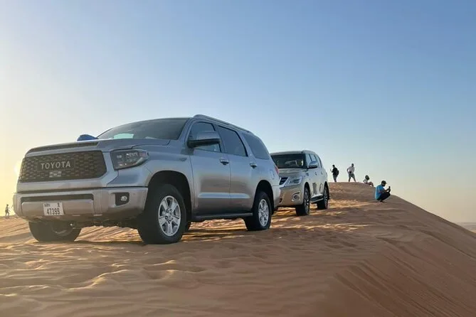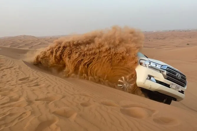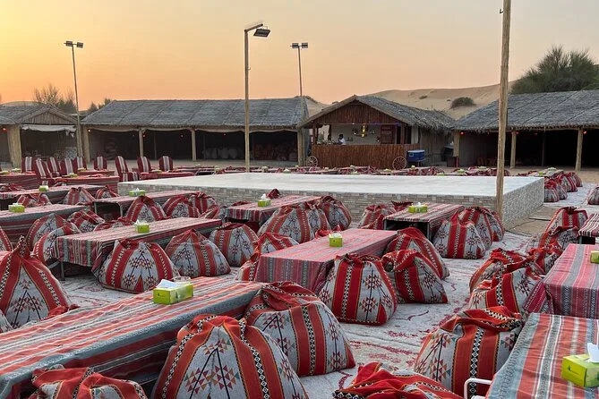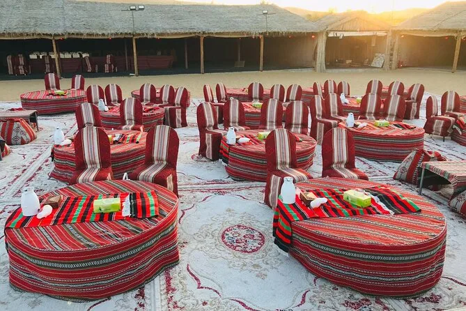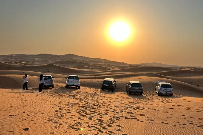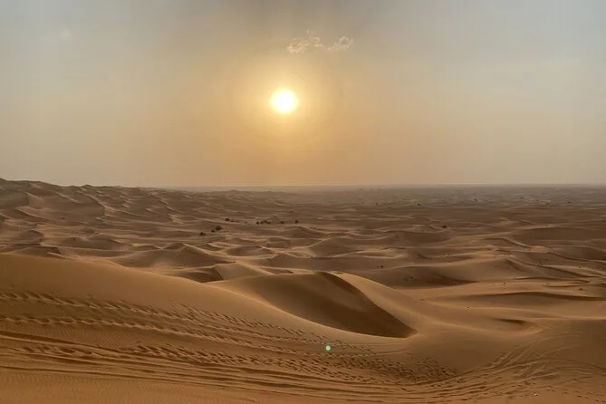Votre journée comprend la prise en charge et le retour à l’hôtel dans Dubaï, de l’eau en bouteille à volonté, un transport en 4x4 climatisé avec un chauffeur expérimenté pour le dune bashing dans les dunes rouges près d’Al Madam (et le quad si sélectionné), des pauses sandboard pour photos ou chutes rigolotes, l’accès à un camp bédouin en soirée avec boissons sans alcool illimitées plus thé ou café, de courtes balades à dos de chameau au coucher du soleil, de petits motifs au henné (surtout pour femmes et enfants), la chicha dans un espace fumeur si vous le souhaitez, des photos en costumes arabes pour les plus téméraires — et enfin un grand dîner BBQ avec options végétariennes et non végétariennes avant de retourner à votre hôtel après la tombée de la nuit.