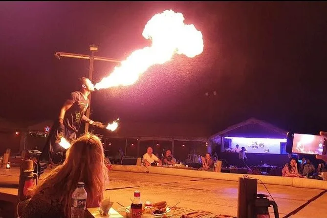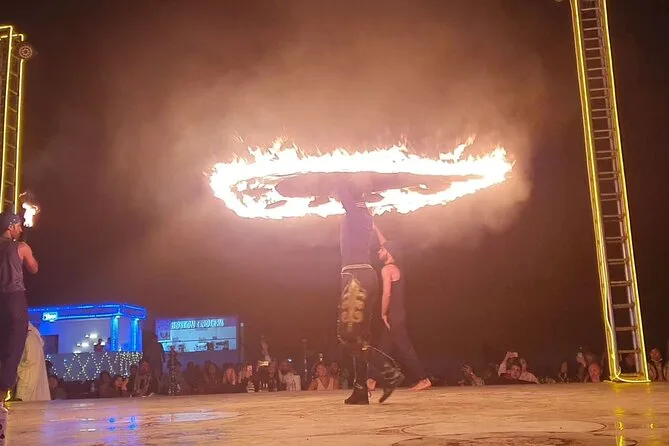 La soirée comprend danse Tanoura, danse orientale et un spectacle de feu (sauf pendant le Ramadan ou les jours secs).