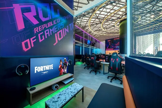 Des rangées de fauteuils confortables font face à de grands écrans — certains sont plongés dans des batailles sur Fortnite, d’autres se détendent sur Minecraft ou regardent Netflix. J’ai testé un casque VR (le gars à côté jouait à Beat Saber et était à fond). Une légère odeur de pop-corn vient du snack-bar, et on peut prendre une boisson fraîche. Ce n’est pas réservé aux gamers hardcore — il y avait des familles avec enfants, des voyageurs seuls, même quelques employés de l’aéroport qui profitaient d’une pause pour jouer vite fait.