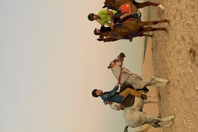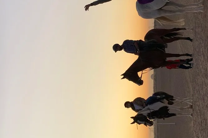 Ce qui m’a frappé d’emblée, c’est la fraîcheur matinale—un léger souffle de sable dans l’air pendant que nous harnachions nos montures. Notre guide, Ahmed, a choisi un cheval adapté à chacun selon notre expérience. Même pour les débutants, tout est fait pour se sentir à l’aise. Les chevaux sont principalement des Arabes, fins et vifs, mais assez doux pour les novices. Nous avons démarré juste au moment où le soleil commençait à émerger derrière les dunes, baignant le désert d’une lumière dorée.