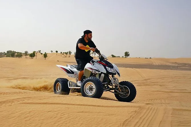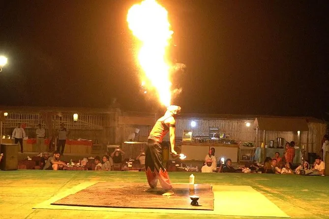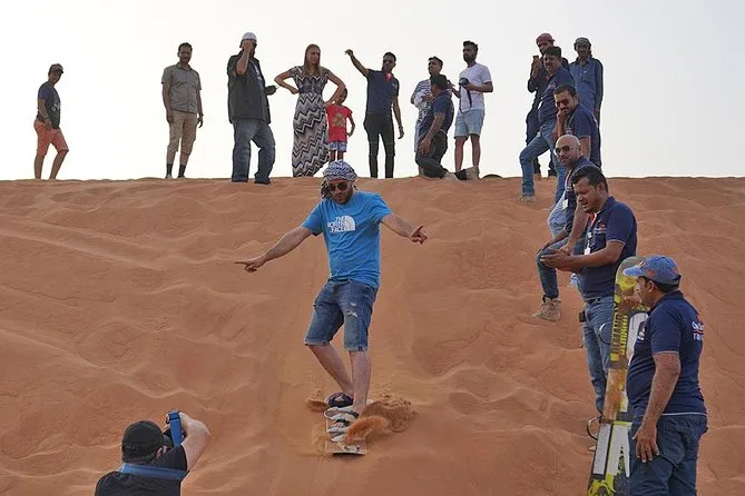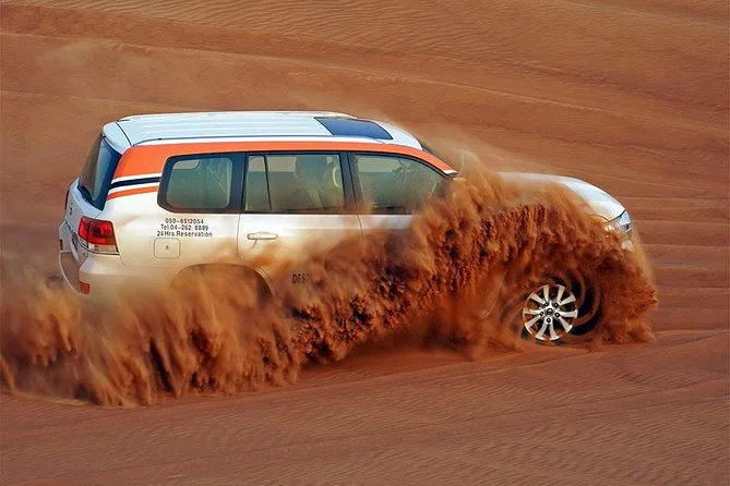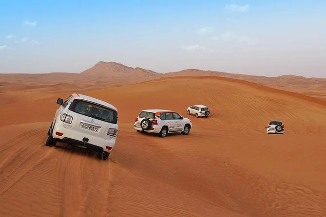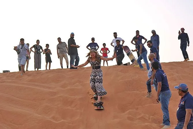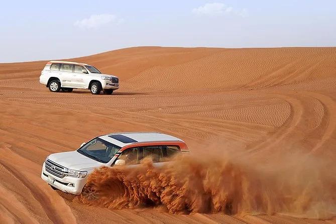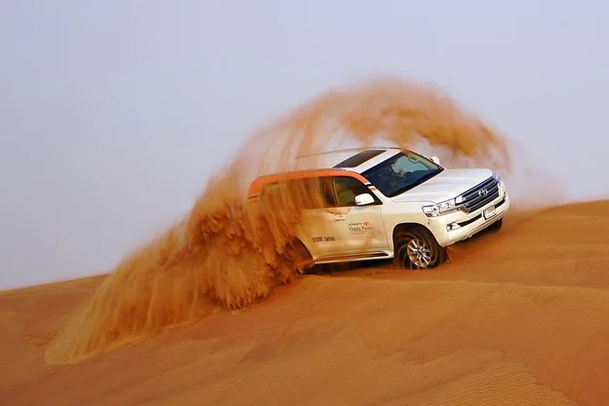Votre journée comprend la prise en charge et le retour à votre hôtel ou lieu choisi à Dubai ou Sharjah en Land Cruiser 4x4 climatisé. Vous ferez du dune bashing sur les sables rouges de Lahbab avec un guide expérimenté, puis testerez le sandboard et une balade à dos de chameau au coucher du soleil. Au camp, vous pourrez vous habiller en costumes arabes, vous faire tatouer au henné si vous le souhaitez, vous détendre avec une shisha ou des boissons à volonté comme le café ou thé arabes — et finir par un dîner buffet BBQ (avec options végétariennes et non végétariennes) accompagné de danses Tanoura, spectacle de feu et danse orientale avant de rentrer le soir.