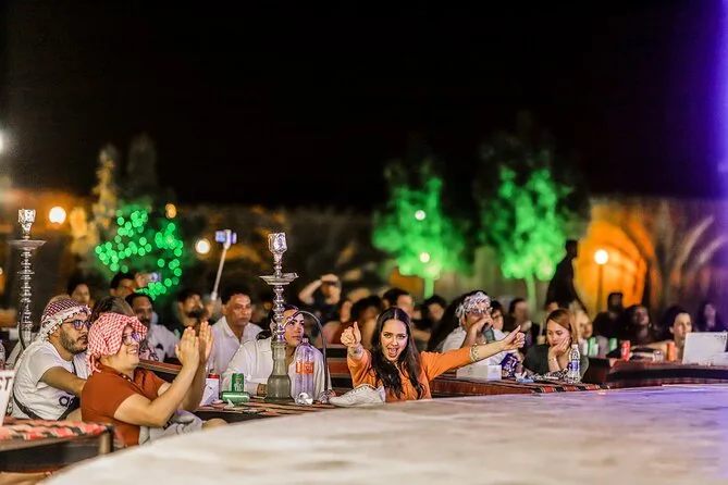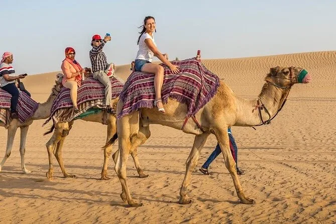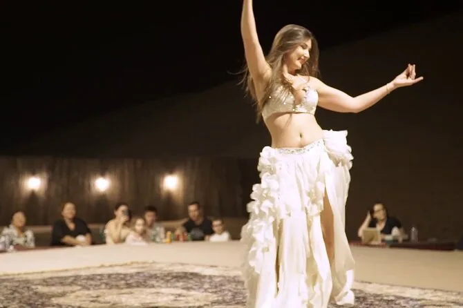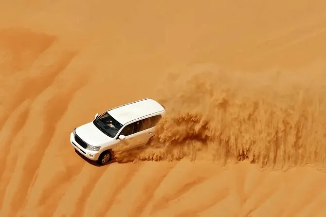 Transferts aller-retour depuis Dubaï, dune bashing en 4x4 avec un chauffeur expérimenté, initiation au sandboard, balades à dos de chameau au camp, tatouages au henné, shisha dans une tente bédouine, spectacles live de danse orientale et Tanura au feu, et un dîner BBQ complet (options végétariennes et non végétariennes).