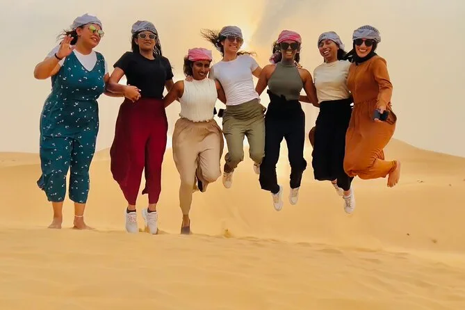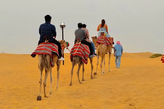 Votre excursion comprend un transport privé en 4x4 depuis votre hôtel ou domicile à Dubaï, toutes les activités de dune bashing (balade à dos de chameau, sandboard), boissons soft illimitées et thé/café au camp, peinture au henné, spectacles vivants (danse du ventre, tanoura, zumba, feu), ainsi qu’un dîner BBQ complet avec options végétariennes et non-végétariennes.