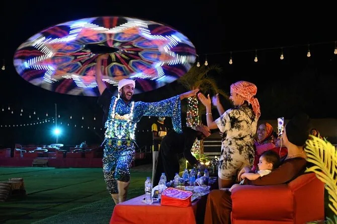 Quand le soleil a commencé à baisser, on est arrivés au camp juste au moment où le ciel se teintait de ce rose orangé si typique du désert. L’ambiance était animée — des enfants s’essayaient au sandboard pour la première fois (j’ai tenté aussi, disons que ce n’est pas si simple), des femmes se faisaient dessiner de délicats motifs au henné sur les mains, et quelqu’un servait un café parfumé à la cardamome dans de petites tasses. Le buffet était prêt peu après : poulet grillé, aubergines fumées, pains plats tout chauds sortis du feu. Entre deux bouchées, on regardait le danseur Tanoura tournoyer si vite que sa jupe formait un tourbillon, puis tout le monde s’est tu pour le spectacle de feu — sauf une petite fille qui éclatait de rire à chaque étincelle.