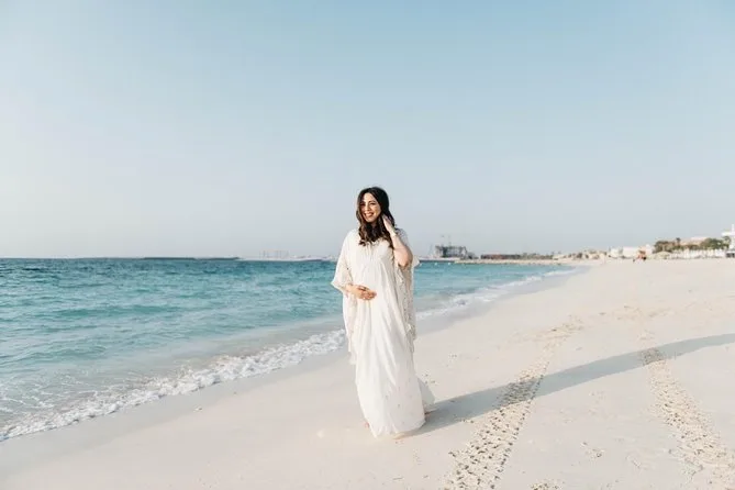 Nous avons ensuite rejoint Jumeirah Beach, les pieds s’enfonçant dans le sable chaud. L’air marin se mêle à l’odeur de crème solaire et de maïs grillé venant d’un vendeur proche. Ahmed nous a proposé de nous rapprocher de l’eau pour des photos plus naturelles — honnêtement, j’ai fini par oublier qu’il prenait des photos. Plus tard, au Burj Al-Arab, il nous a montré comment la lumière du soir caresse parfaitement la façade pour des portraits réussis. Ce n’est pas toujours une question de pose, parfois c’est juste capturer ce regard quand on découvre quelque chose de nouveau.