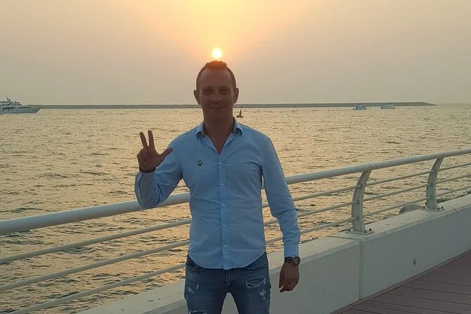 Le dernier arrêt fut la mosquée de Jumeirah — la pierre claire qui brillait doucement sous le soleil couchant, les portes grandes ouvertes pour ceux qui veulent jeter un œil à l’intérieur. Des enfants jouaient à côté, et un homme plus âgé balayait les marches avec une patience tranquille. Ce moment m’a marqué plus que tous les bâtiments étincelants vus dans la journée ; peut-être parce qu’il y régnait une paix rare. En tout cas, à ce moment-là, j’avais complètement perdu la notion du temps — c’est sûrement le signe d’une bonne visite de la ville.