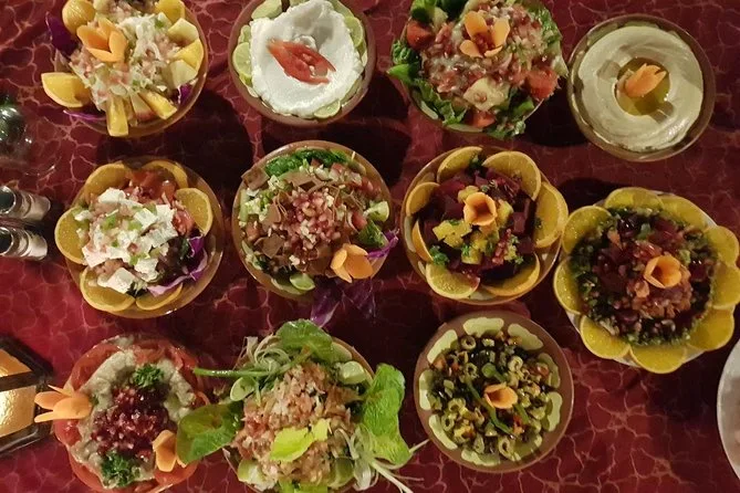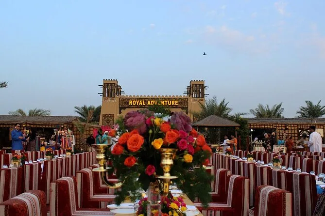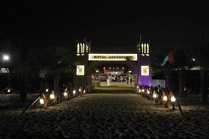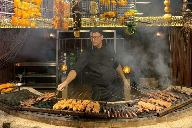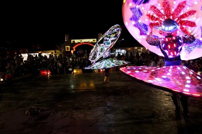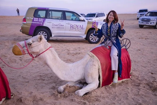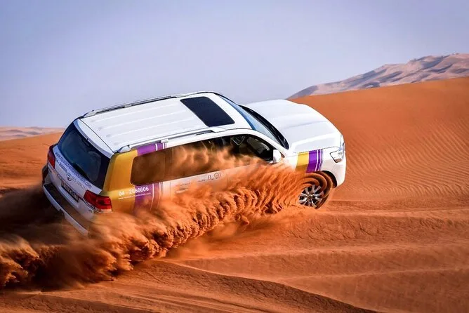 Votre soirée commence par une prise en charge à l’hôtel en Land Cruiser 4x4 VIP avec un guide anglophone, puis une session de dune bashing à travers les dunes dorées avant d’arriver au camp où vous serez accueillis avec douceurs arabes, café et dattes ; profitez de courtes balades à dos de chameau et essayez la peinture au henné si vous le souhaitez ; installez-vous dans votre espace privé pour un dîner buffet BBQ international (avec options végétariennes) accompagné de boissons à volonté ; assistez aux danses Tanoura, orientale et aux spectacles de feu avant de retourner à votre hôtel après le coucher du soleil.