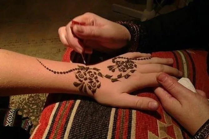 En arrivant au camp, une odeur nous a tout de suite enveloppés — viande grillée mêlée à la douceur du shisha et du café. On nous a offert de petites tasses de café arabe et des dattes (je n’aimais pas les dattes avant, mais celles-ci étaient collantes et sucrées, parfaites). Il y avait d’autres voyageurs, mais l’endroit ne semblait pas bondé, sûrement parce que notre table était un peu à l’écart. On a essayé des robes traditionnelles pour les photos — la mienne glissait sans cesse de mon épaule. Une femme se faisait faire un henné sur la main juste à côté, alors je me suis laissée tenter aussi. Les mains de l’artiste bougeaient si vite que je n’ai presque pas vu quand elle a fini, jusqu’à ce qu’elle me sourie.