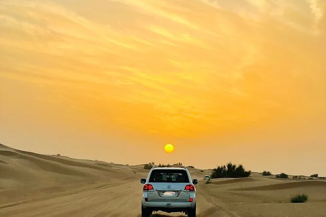 Votre soirée comprend la prise en charge aller-retour à l’hôtel en véhicule climatisé, une session de dune bashing guidée, du sandboard, une balade à dos de chameau au coucher du soleil, de l’eau en bouteille tout au long du trajet, ainsi que l’accès à un camp bédouin moderne où vous dégusterez café arabe et dattes avant un dîner barbecue avec spectacle vivant—et vous pourrez aussi profiter de la chicha ou d’un tatouage au henné avant de retourner à votre hôtel.
