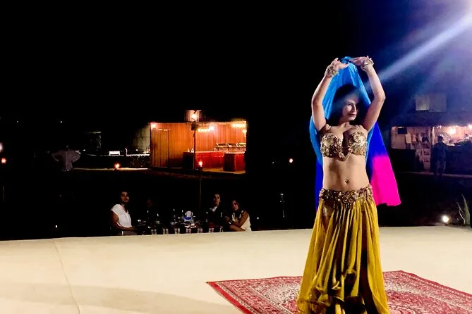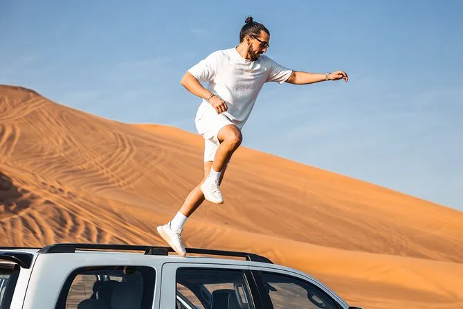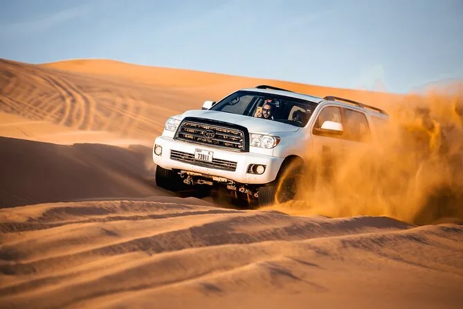 Le tour comprend dune bashing, sandboard, balade courte à dos de chameau pour photos, spectacles en live (danse orientale, feu, danse Tanura), tatouage au henné pour les femmes, chicha, photo avec un faucon, snacks et boissons, ainsi qu’un dîner BBQ buffet.
