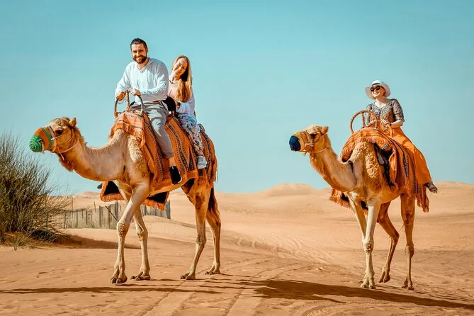 Votre soirée comprend la prise en charge et le retour au Dubai Mall en véhicule climatisé avec un guide local qui vous emmène faire du dune bashing sur les hautes dunes rouges de la région de Lehbab. Vous testerez le sandboard et profiterez d’une courte balade à dos de chameau pour les photos avant de rejoindre un camp bédouin où vous savourerez des snacks, boissons à volonté, spectacles en live (danse orientale, feu, danse Tanura), chicha, tatouage au henné (pour les dames), photos avec un faucon, et un dîner buffet BBQ avec options végétariennes et non végétariennes, avant de retourner à votre point de départ.