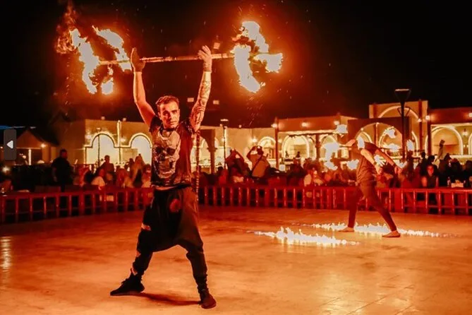Vous profiterez d’une courte balade à dos de chameau, du sandboard, de spectacles vivants (feu, danse du ventre), de tatouages au henné, d’un espace shisha et d’un dîner barbecue.