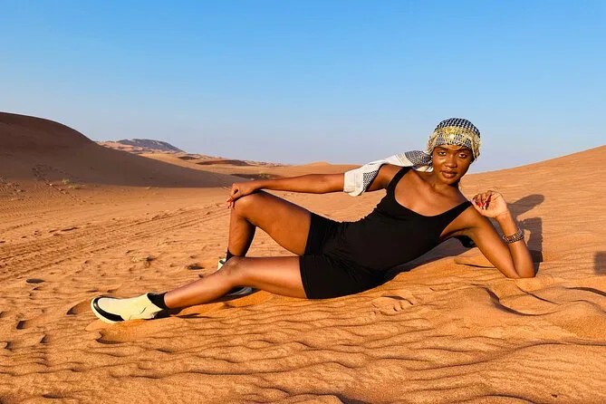 Ensuite, place au dune bashing — c’est-à-dire dévaler et grimper des collines de sable en 4x4, avec tout le monde dans la voiture qui passe de rires nerveux à cris de surprise. Khalid semblait kiffer chaque seconde ; à un moment, il a mis de la musique arabe à fond et a crié « accrochez-vous ! » alors qu’on glissait de côté sur une pente. Mes paumes étaient moites en tenant le siège, mais c’était bizarrement fun. On s’est arrêtés pour des photos juste au moment où le soleil commençait à se coucher — un silence presque total, à part le vent qui soufflait dans l’herbe. J’ai aussi testé le sandboard (pas très élégant), et j’ai fini avec du sable partout, même dans mes chaussures.