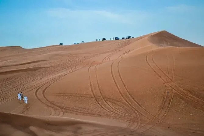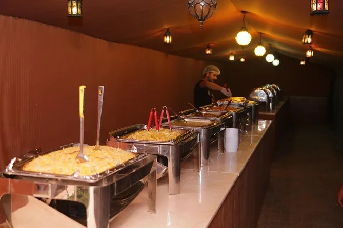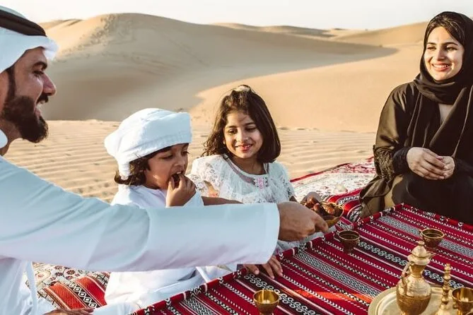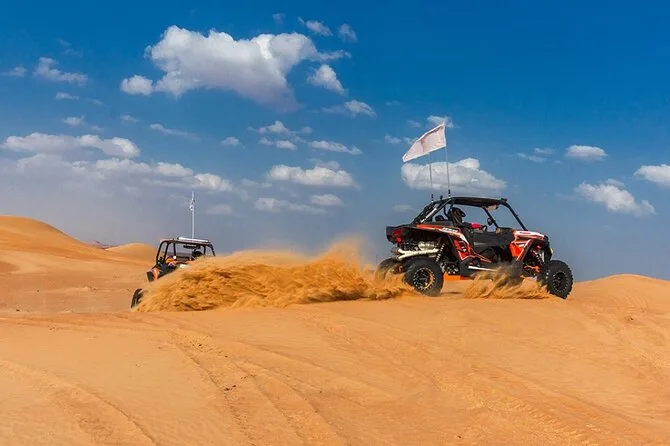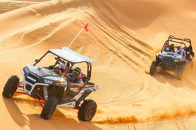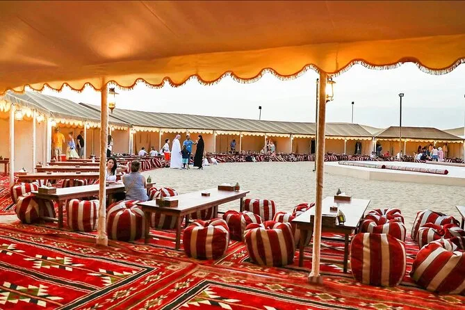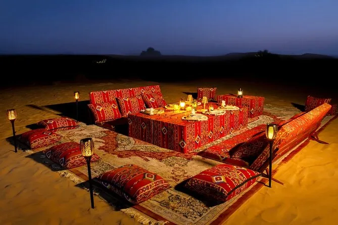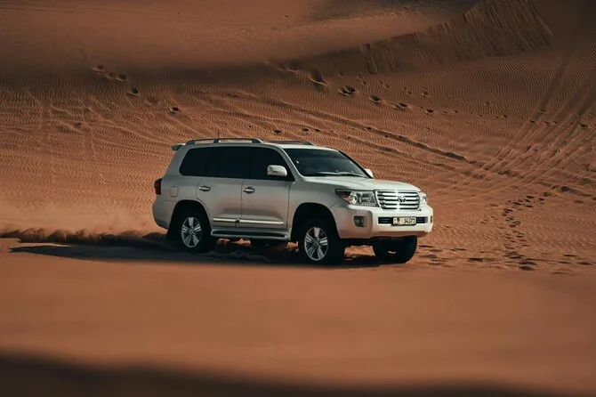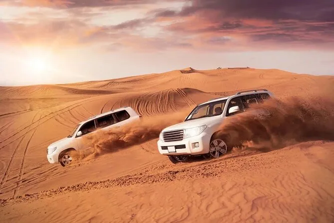 Votre soirée comprend la prise en charge à votre hôtel ou point choisi à Dubaï ou Sharjah en 4x4 Land Cruiser (en groupe), un dune bashing palpitant dans le désert de Lahbab, du temps pour le sandboard et la balade à dos de chameau ainsi que la possibilité de se faire faire un henné. Au camp, vous trouverez du thé arabe, du café avec des dattes, de l’eau en bouteille et des boissons non alcoolisées. Le dîner est un buffet BBQ en direct avec plats végétariens et non végétariens, avant de vous détendre dans les salons de shisha sous les étoiles en regardant les spectacles de danse orientale et Tanoura — puis retour à votre hôtel ou port une fois la soirée terminée.