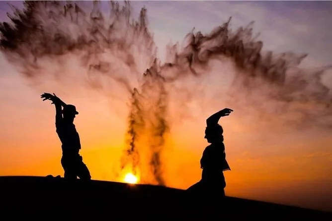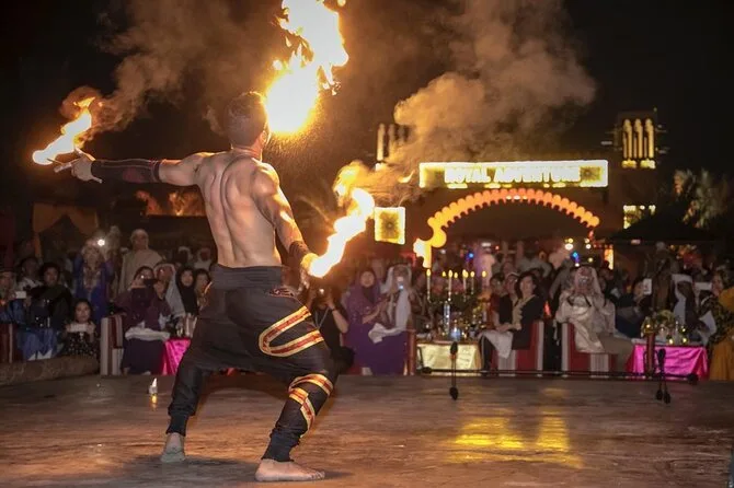 Votre soirée comprend la prise en charge et le retour à l’hôtel en 4x4 Land Cruiser depuis les limites de Dubaï, une session de dune bashing palpitante avec un chauffeur expérimenté, une courte balade à dos de chameau pour les photos, des douceurs arabes avec café et dattes à l’arrivée dans un camp bédouin animé, boissons sans alcool à volonté, un buffet BBQ international avec options végétariennes, des spectacles de danse du ventre, tanoura et feu par des artistes de renom, des sessions de henné pour ceux qui veulent essayer, des coins shisha pour se détendre après le dîner — et le temps d’admirer le coucher de soleil avant de rentrer tard à l’hôtel.